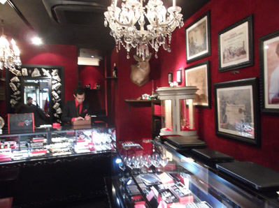 天井から大きなシャンデリアが下がる店の内装は壁が赤で他は黒が基調となっている。「赤と黒」、スタンダールだ、読んでないけど。その壁には、このショコラティの歴史を物語る写真や絵の描かれた賞状などがいろいろ掛けられている。それと、鹿の剥製が。その鹿の顔を