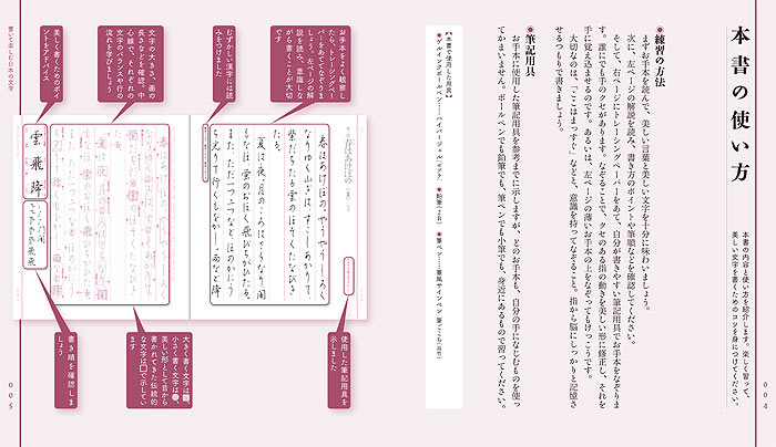 一文字ずつ習うスタイルとは違って、リズムや旋律を奏でるように、集合体としての文字の流れの美しさを勉強できるのが本書の特長です。