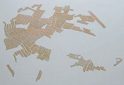 西澤:これ、実は連作でしてね。上空から見た構図で、ホントはいるんだけれど、まだ小さすぎて見えないという設定です。だんだん高度が下がってきて、「何かやってるぞ」となんとなく見えてきて、もっと下がると細かいところまで解ってくる。実際の地図から起こしたんですよ。