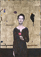 中堀慎治作品ですぐ思い浮かぶのは、金箔の背景にほのかに愁いにみちた瞳で、こちらを見つめる外国人女性像。日本的雅と西洋象徴主義的な趣が巧みに融合した独自の絵画世界。今回の個展は、以前から手掛けていた木彫のマリオネット、自身の顔から型取りし制作したマスクなどで構成。また、2009年から中堀が実行委員長として奔走した、世界文化遺産の京都二条城や清水寺などで開催した「観○光」展。それらに対する中堀慎治の思いを語ってもらった。