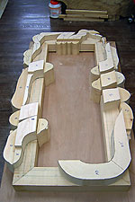 なぜかというと、今度その図面をトレーシングペーパーに描き写し、さらに製材した木材にトレースするからだ。建築家や工業デザイナーと違い、この作業にC A D ( キャド )もパソコンも使わない。使うのはカーボン紙だけ。手作業でトレースした図面と木材との間にカーボン紙を挟み、またその上からなぞるのだ。まさにローテクの極み。 この図面は正面図と側面図、または上面図のいずれか2面を描く。2面図なので、大事なことはこのとき各部分の整合性がないといけない。 |
